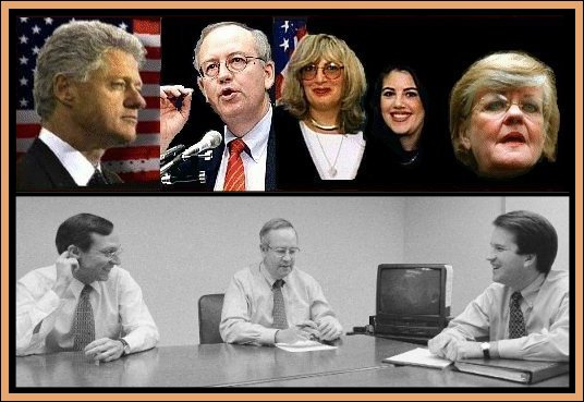 The picture above is a clear reflection of what incompetent people who hijack democracy to fulfill their own peculiar interests look like. Independent Counsel Kenneth Starr, center, talks with Deputy Independent Counsel John Bates, left, and aide Brett Kavanaugh, right, in the Office of the Solicitor General during the Whitewater Investigation on November 13, 1996. That partisan witchhunt eventually morphed into the failure to remove President Bill Clinton from office. Needless to say, it is now very clear that the partisan snipers who are responsible for impeaching Clinton have destroyed irony through the current hypocrisy of excusing Trump's multiple crimes, and in retrospect, that makes former President Clinton look like a saint compared to his lawless critics. Ken Starr has done a geat deal of damage to the interests of democracy. Why hasn't he been publicly shamed if not prosecuted for obstructing justice over and over and over again? Do people understand the fact that he was essentially the Rudy Giulani of the effort to destroy Bill Clinton. Thankfully, today people are more aware of the partisan hit squad tactics that are deployed in the name of destroying political opponents, and the current effort to destroy Joe Biden through the tactics of lunatics like Rudy Giuliani are falling on deaf ears. Sadly, even though Bill Clinton survived, the details of his impeachent have been oveshadowed by gossip and the fact that the attempt to remove him from office was absolutely inappropriate has been largely ignored. In particular, the 'Get Clinton Squad' met regularly at the home of former Justice Department official Ted Olson, a longtime close friend and associate of Kenneth Starr and of Olson's wife Barbara, who was chief counsel for Rep. Dan Burton's House Government Reform and Oversight Committee. Burton's hyperpartisan committee had been noisily conducting investigations of the 'Chinagate' allegations around Democratic Party campaign fundraising and of other alleged Clinton administration transgressions. The gatherings included: Whitewater prosecutor Kenneth Starr, Federal appeals court judge Laurence Silberman, former judge Robert Bork, Supreme Court associate justice Clarence Thomas, wall street journal editor Robert Bartley, American Spectator editor Emmett Tyrrell, and many other political, partisan snipers. A glimpse into the Starr/Olson cabal can be found in the July 1997 esquire magazine, in an article by David Brock, titled "Confessions of a Right-Wing Hit Man." Brock was the author of the Scaife-financed Troopergate article in the January 1994 American Spectator, on whose board Ted Olson sat. Brock described how he had been a guest at the wedding of Ted and Barbara Olson in the summer of 1996, where the entire anti-Clinton establishment was on hand, including Starr, former Bush White House Counsel C. Boyden Gray, and the Wall Street Journal's Bartley. Barbara Olson dis-invited Brock from another party at her home a few weeks later--after word had leaked out that Brock's new book was too sympathetic to the First Lady. The Olsons were the direct link between Starr and the Justice Department permanent bureaucracy around Jack Keeney and Mark Richard. Ted Olson played the central role in putting together Starr's staff and was responsible for the collection of career Justice Department prosecutors who were recruited to Starr's operation. Since Starr himself is not a prosecutor and has never tried a criminal case in his life, he was totally dependent on the thugs whom Olson was responsible for bringing on board. Olson was also the link between Starr and Paula Jones's attorneys. Olson and Robert Bork played judges in a "moot court" practice session with Jones's lawyers before they argued the Jones v. Clinton case. The practice session was held at the Army-Navy Club in Washington. There is also a tie-in to Linda Tripp ...she met with Paul Jones's lawyers on the evening before they took President Clinton's deposition. Tripp briefed Jones's lawyers on her conversations with Monica Lewinsky, which were electronically monitored by the FBI under the direction of Starr's office. Tripp's lawyer James Moody, who was hired to put Tripp in contact with Starr, is in the orbit of the rigfht-wing "public interest law firms" tied to Olson and Starr, and which were funded by Scaife. Moody had done legal work for both the Landmark Legal Foundation and for the Washington Legal Foundation--previously known as the Capital Legal Foundation. Olson and Starr are both part of a tight network of lawyers who work in "conservative" legal foundatons and other organizations. They both sat on the Legal Advisory Council of two such groups; the National Legal Center for the Public Interest and the Washington Legal Foundation--both of which were bankrolled by Scaife. The politically motivated hit squad that tageted Clinton was essentially lawless, and instead of holding them accountable, especially Kenneth Starr and Ted Olson, they continued to obstruct justice and essentially stole the election in 2000 through a stacked, Supreme Court. Thankfully, the Americn people were the real jury of Clinton's politically motivated impeachment; 66% of the American people wanted the impeachment stopped, and those who did not should have been shamed and/or prosecuted for obstuction of justice. On August 20 1998, in an article titled 'Choreogaphy', I wrote, "Monica Lewinsky is scheduled to testify before Starr's grand jury today -yawn, yawn. The media is going to cover it as if Lewinsky is going to be cross-examined or expose anything beyond Starr's script. Who told us and when did we find out? After Lewinsky's last appearance before the grand jury, Jonah Goldberg said that Lewinsky would be called back to testify after Clinton had provided his testimony before the grand jury. How convenient. The Goldbergs have also said that Bruce Lindsey and Vernon Jordan are the probable sources of the "talking points". Monica Lewinsky, it is wi